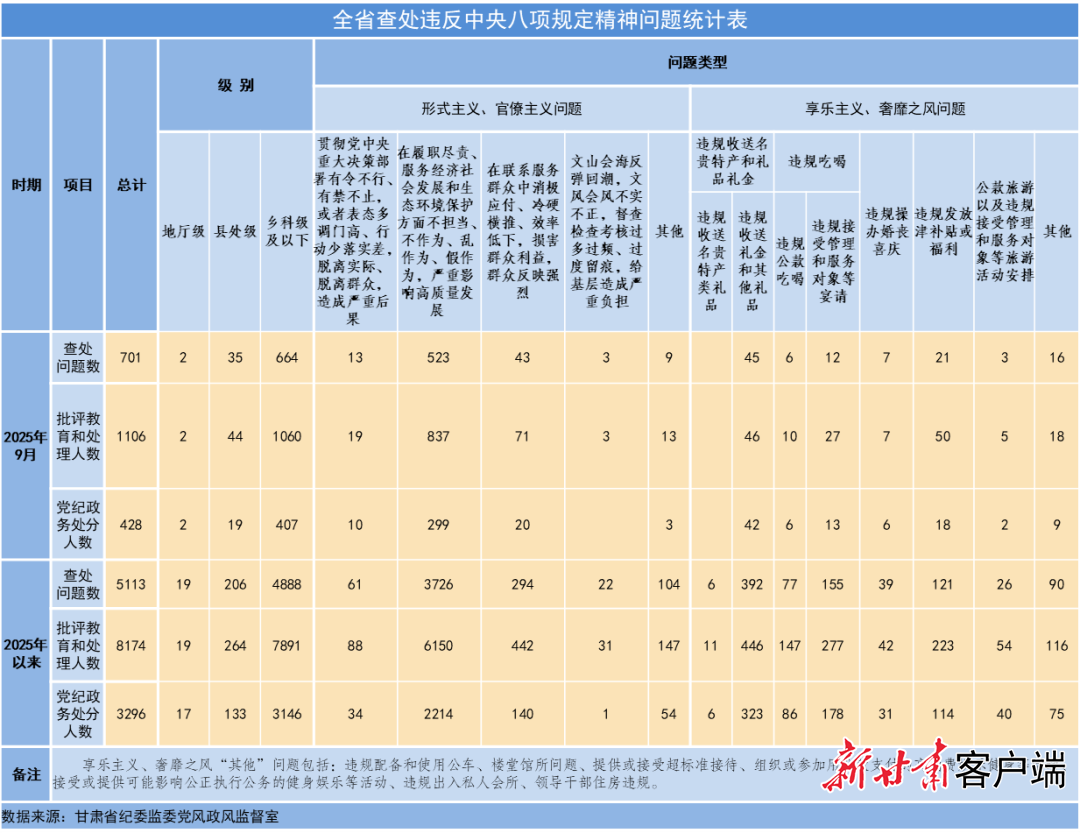 马颖)省纪委监委10月13日公布了2025年9月全省查处违反中央八项规定精神问题汇总情况。当月,全省共查处违反中央八项规定精神问题701起,批评教育和处理1106人,其中党纪政务处分428人。