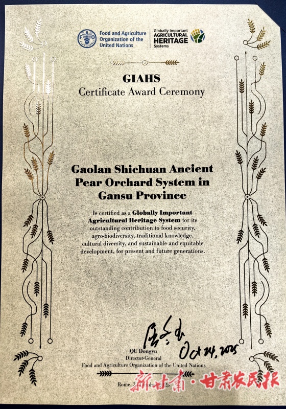 10月31日,意大利罗马。联合国粮农组织(FAO)会场内,当“全球重要农业文化遗产”的烫金证书被郑重颁授给远道而来的甘肃代表团时,会场响起的掌声,穿山越海,瞬间回荡在皋兰县什川镇那片古老的梨园里。