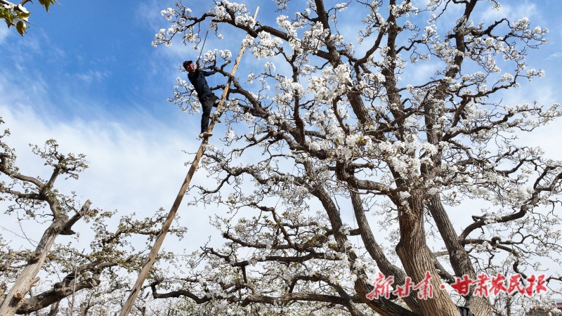 梨农利用“天把式”给梨花授粉。张敬德 摄