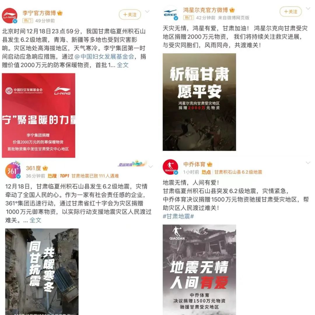 @特步 发布消息称,特步集团紧急响应,通过中国下一代教育基金会向甘肃省、青海省受灾地区捐赠2000万元御寒保暖物资,用于抗震一线应急救灾及灾后重建工作。