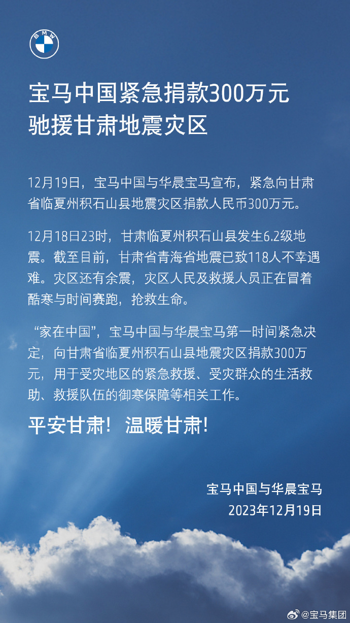 12月19日,宝马中国与华晨宝马宣布,紧急向甘肃省临夏州积石山县地震灾区捐款人民币300万元。