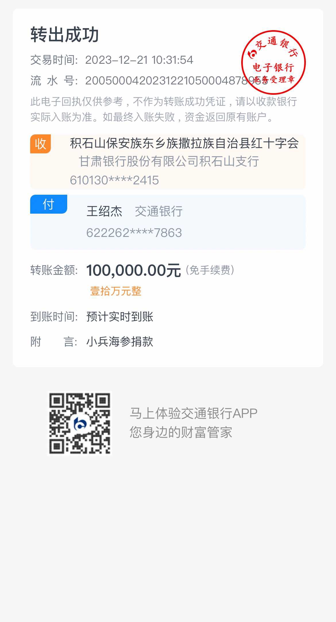 一方有难,八方支援。积石山6.2级地震发生后,爱心力量不断向震中汇聚。辽宁大连的企业“小兵海参”在得知甘肃地震后,向积石山保安族东乡族撒拉族自治县红十字会账户捐款10万元,支援积石山县抗震救灾和灾后重建工作。