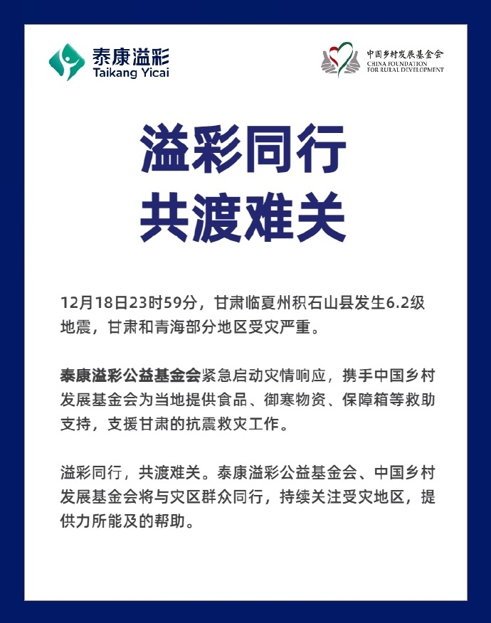 @泰康溢彩公益基金会 紧急启动灾情响应,携手中国乡村发展基金会为当地提供食品、御寒物资、保障箱等救助支持,支援甘肃的抗震救灾工作。