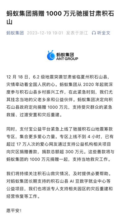 蚂蚁集团捐赠1000万元驰援甘肃积石山:12月18日,6.2级地震突袭甘肃省临夏州积石山县,灾情十分严峻。蚂蚁集团在官微宣布将向积石山县政府定向捐赠1000万元,用于受灾地区紧急救援、过渡安置和灾后重建。同时,支付宝公益平台紧急上线了驰援积石山地震筹款专区,集合更多爱心力量。专区上线不到4小时,已有超过17万人次的爱心网友通过支持公益机构相关项目向灾区捐赠善款,捐款总额超300万元。这些善款将与蚂蚁集团的1000万元捐赠一起,支持当地救灾工作。