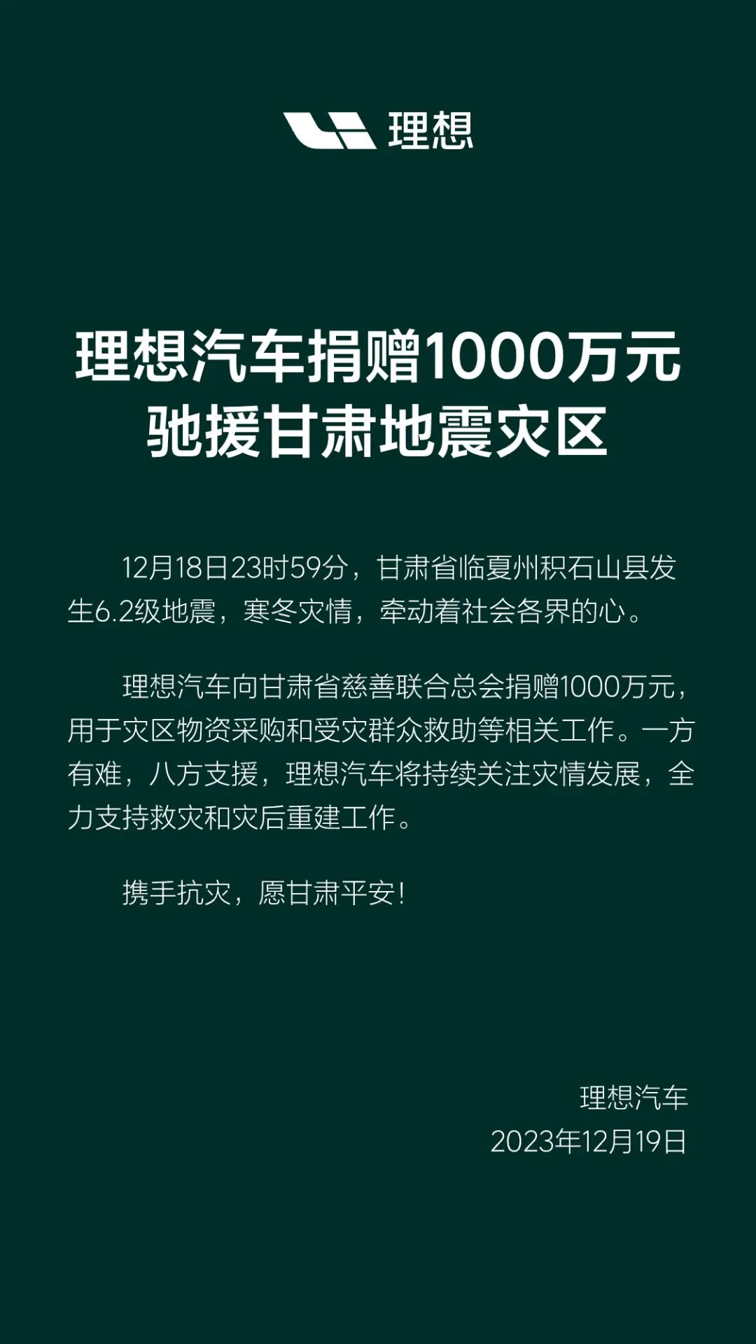 12月19日,理想汽车捐赠1000万元驰援甘肃地震灾区。