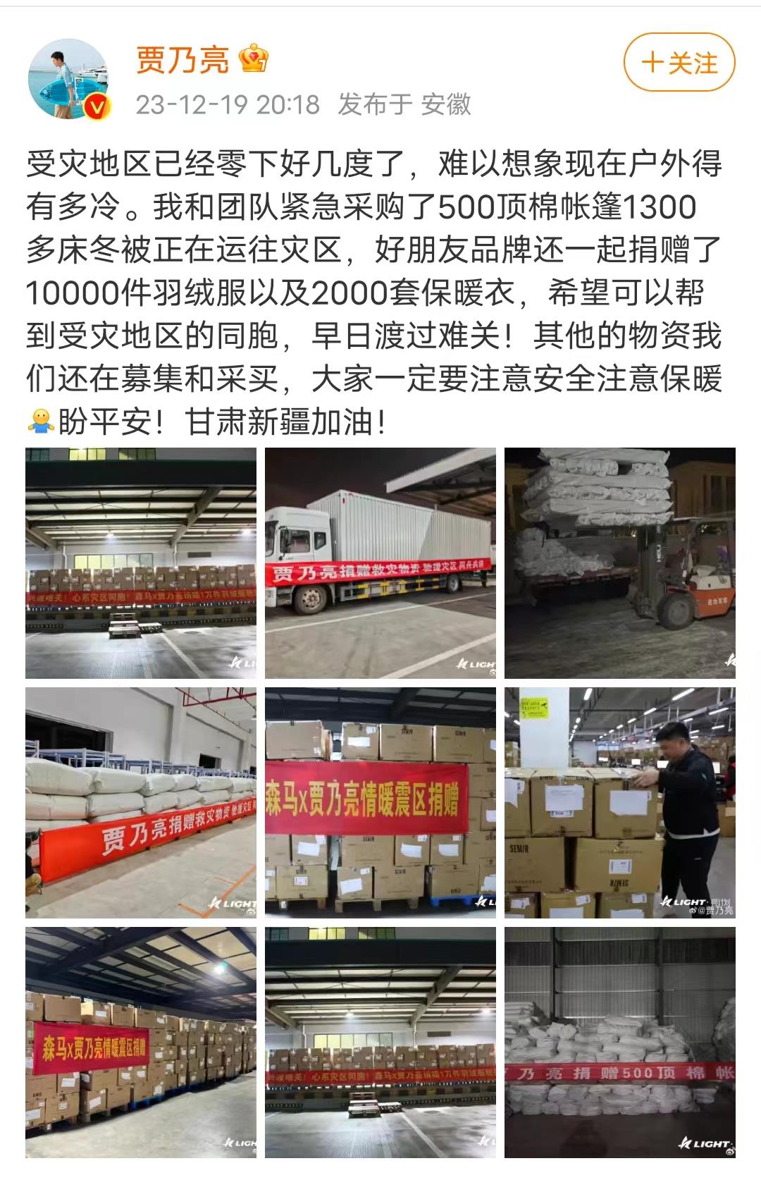 演员贾乃亮和团队紧急采购了500顶棉帐篷1300多床冬被正在运往灾区,好朋友品牌还一起捐赠了10000件羽绒服以及2000套保暖衣,希望可以帮到受灾地区的同胞,早日渡过难关!