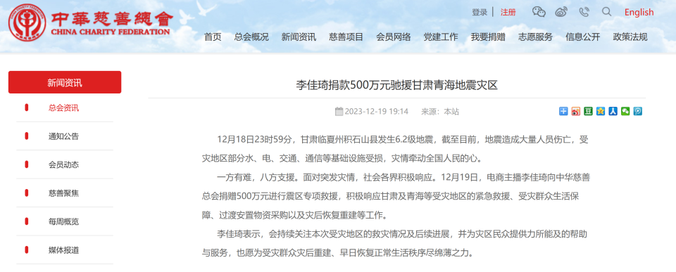 据中华慈善总会官网消息,12月19日,电商主播李佳琦向中华慈善总会捐赠500万元进行震区专项救援,积极响应甘肃及青海等受灾地区的紧急救援、受灾群众生活保障、过渡安置物资采购以及灾后恢复重建等工作。