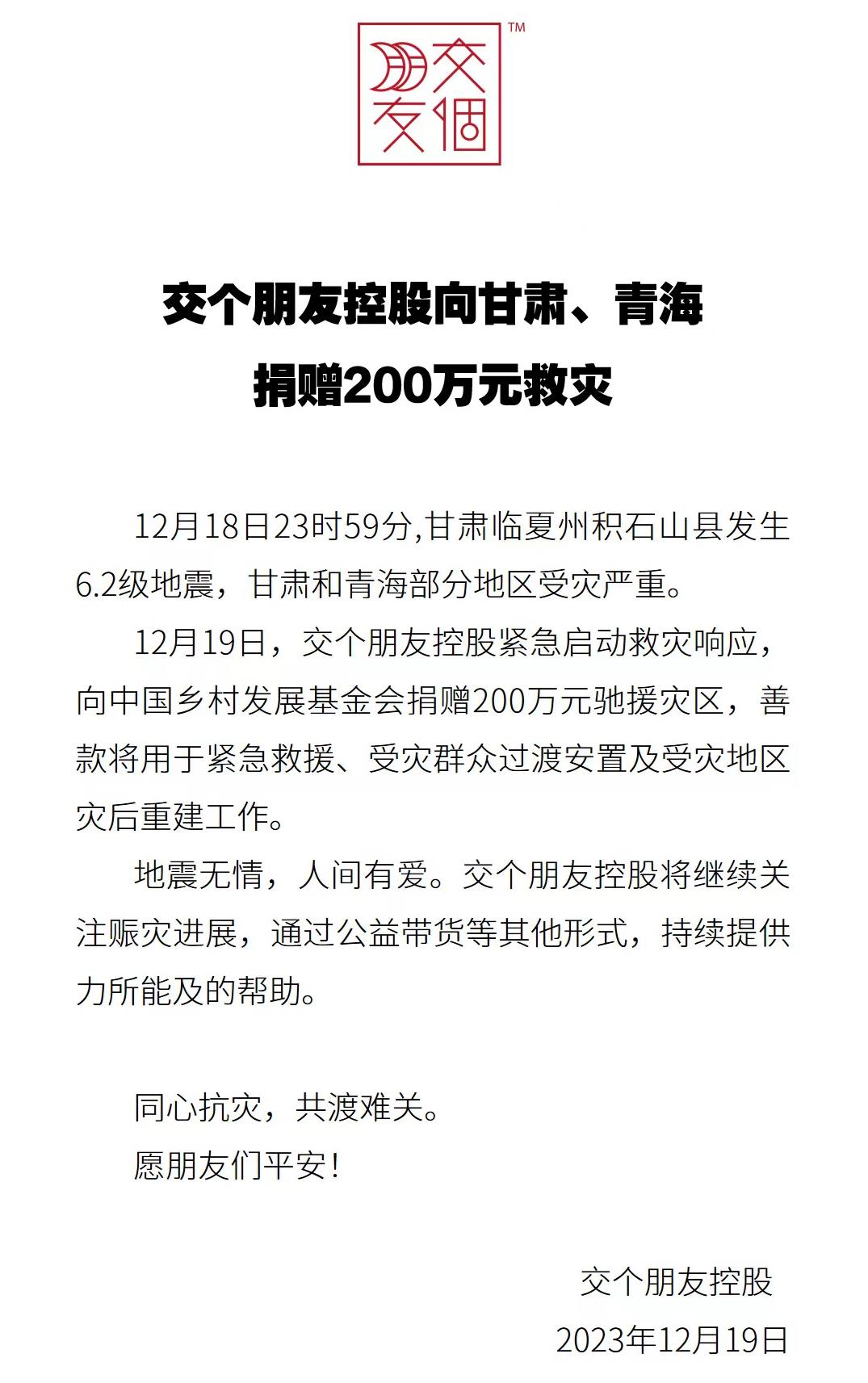 @罗永浩 交个朋友控股向甘肃、青海捐赠200万元救灾。