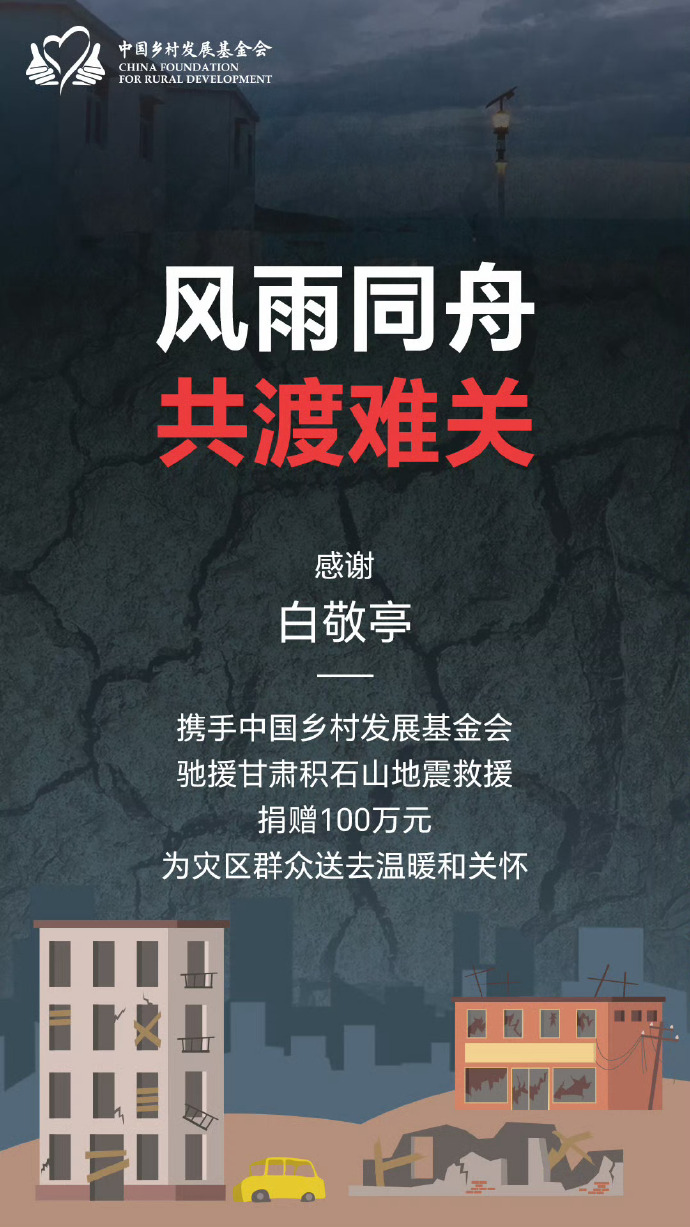 白敬亭先生携手中国乡村发展基金会驰援甘肃积石山地震救援,捐赠100万元,为灾区群众送去温暖和关怀。风雨同舟,共度难关。