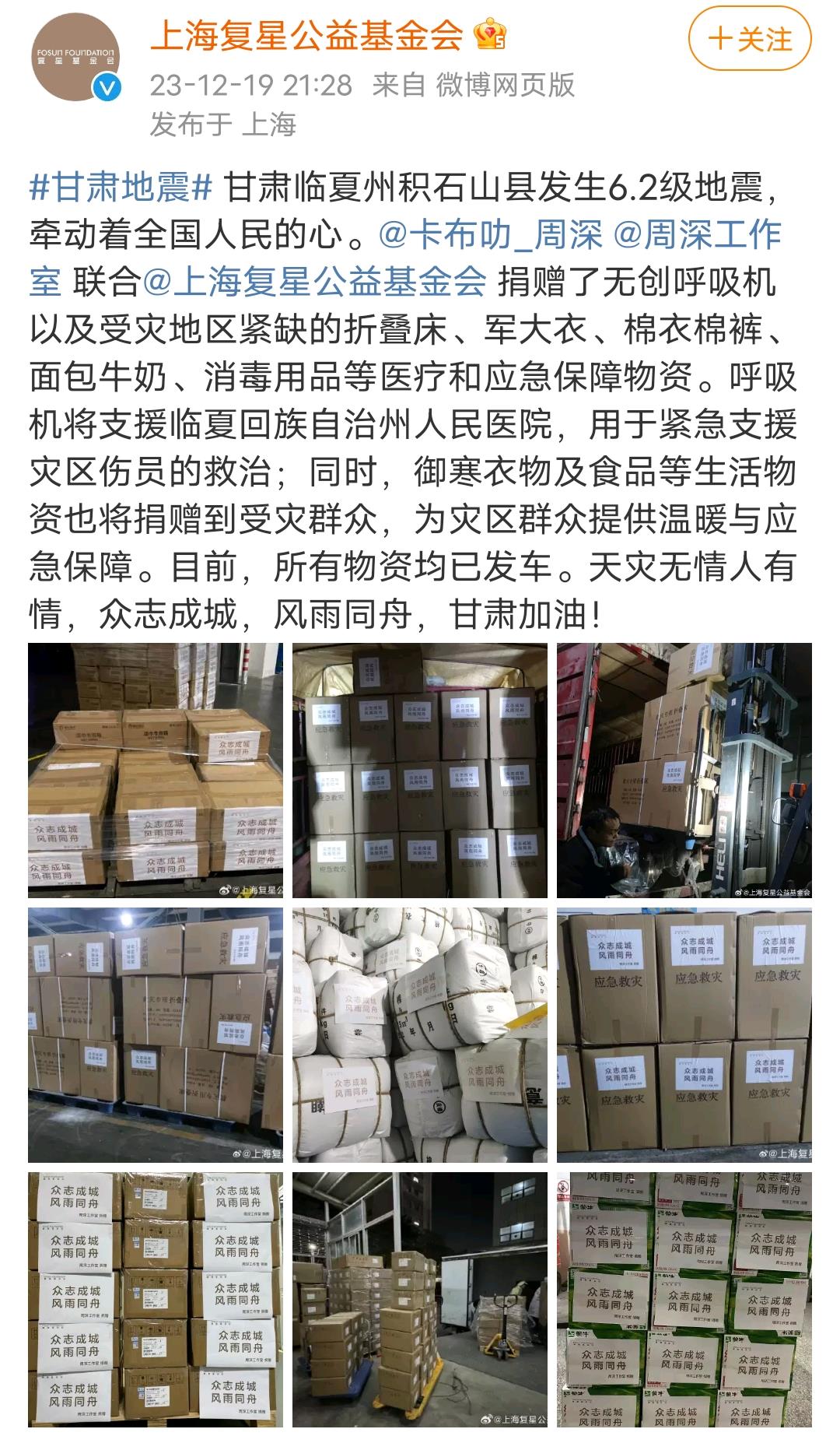 @卡布叻_周深 @周深工作室 联合@上海复星公益基金会 捐赠了无创呼吸机等物资。