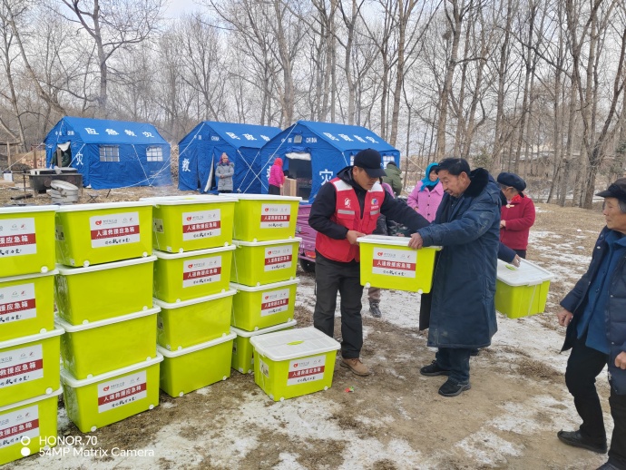 12月20日,中国乡村发展基金会@人道救援 共为甘肃积石山受灾群众发放棉被5000床、人道救援应急箱2340个、自热米饭(清真)7000盒,惠及石塬镇肖红坪村、大河家镇大河家村等8个村22722人。