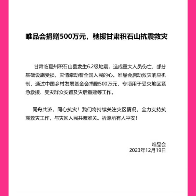 @唯品会 捐赠500万元,驰援甘肃积石山抗震救灾。善款将用于受灾地区紧急救援、受灾群众安置及灾后重建等工作。