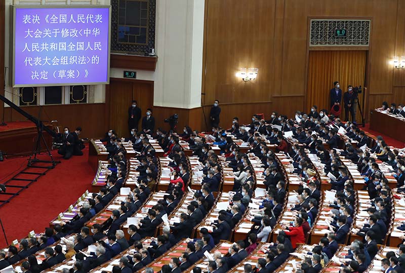 2021年3月11日,十三届全国人大四次会议在北京人民大会堂闭幕。此次会议对全国人民代表大会组织法、全国人民代表大会议事规则作出修改。 新华社记者 张玉薇 摄
