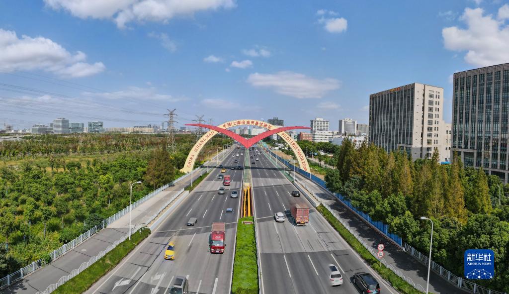 这是中国(上海)自由贸易试验区保税片区的标志性景观“海鸥门”(10月17日摄,无人机照片)。新华社记者 方喆 摄