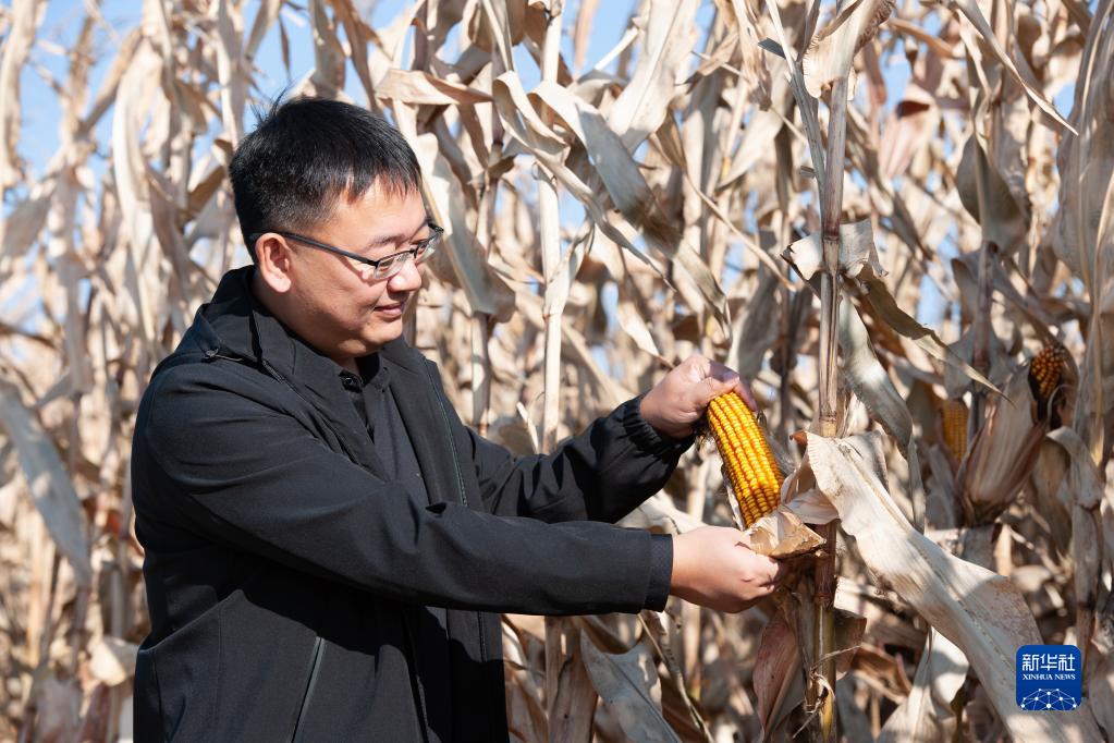 10月16日,黑龙江省宝清县农业农村局副局长张强在农田中查看玉米成熟情况。新华社发(鄂丽霞 摄)