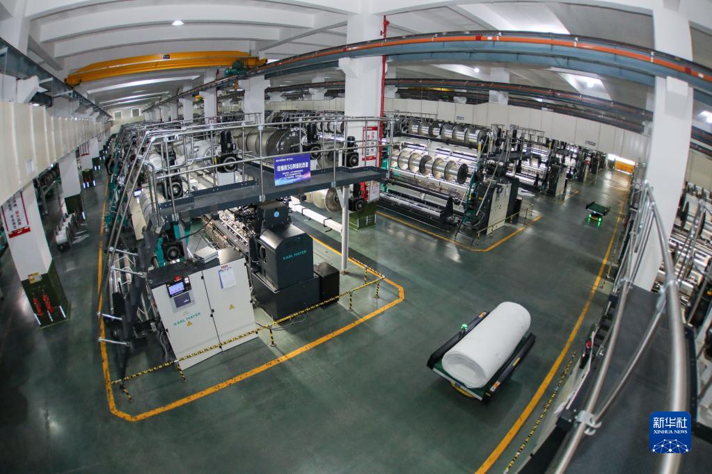 福建晋江,华宇铮蓥集团第五经编车间内,一排排经编机正在高速运转,AGV物流机器人不停穿梭其中。