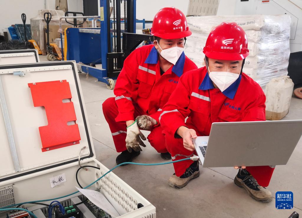 10月16日,在新疆乌鲁木齐金风科技天翼达坂城试验风电场,场长张新旺(右)和同事一起工作。新华社发(周凯 摄)