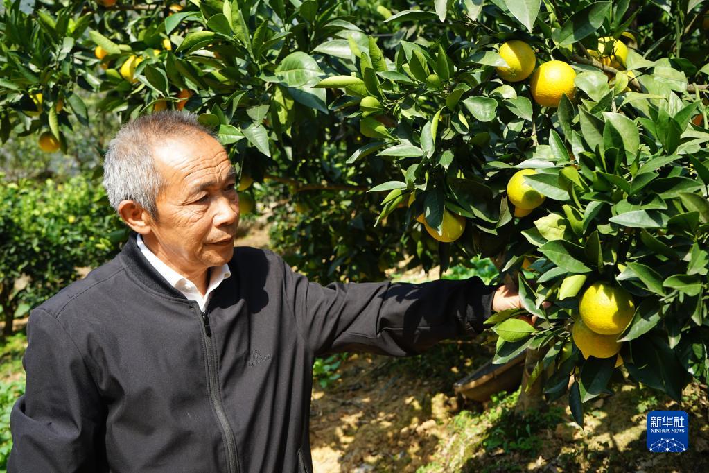 10月16日,全国脱贫攻坚楷模、重庆市巫山县下庄村党支部书记毛相林在自家柑橘园中查看柑橘长势。新华社记者 李晓婷 摄