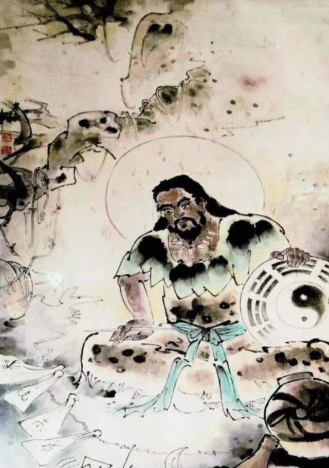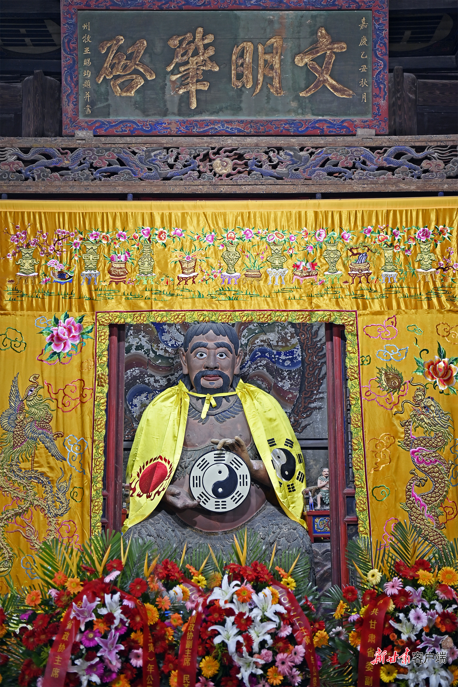 天水伏羲庙内手托先天八卦太极盘,位于先天殿内的伏羲彩绘像。