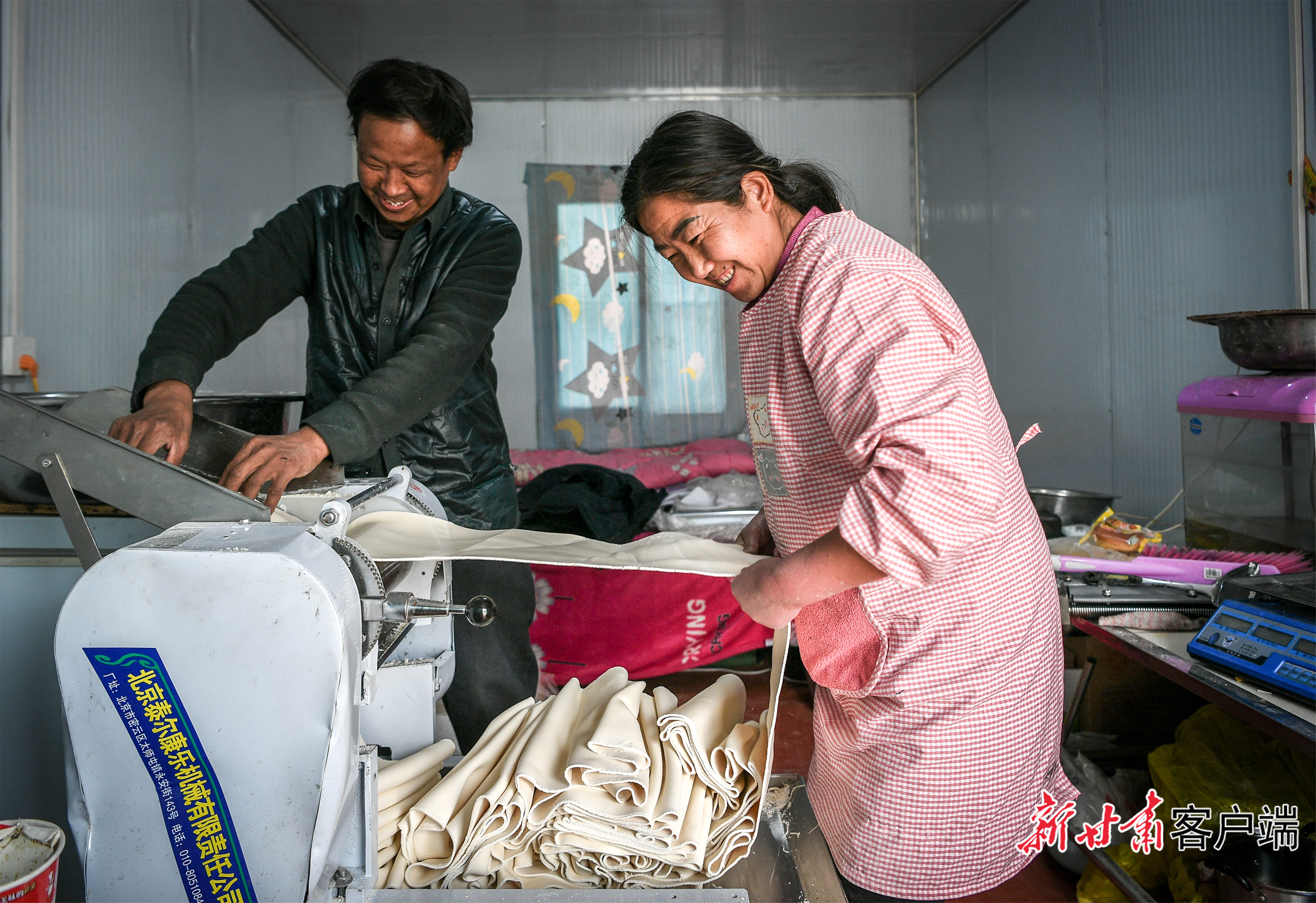 石塬镇宋家沟村安置点,压面铺店主夫妇正在制作面条。