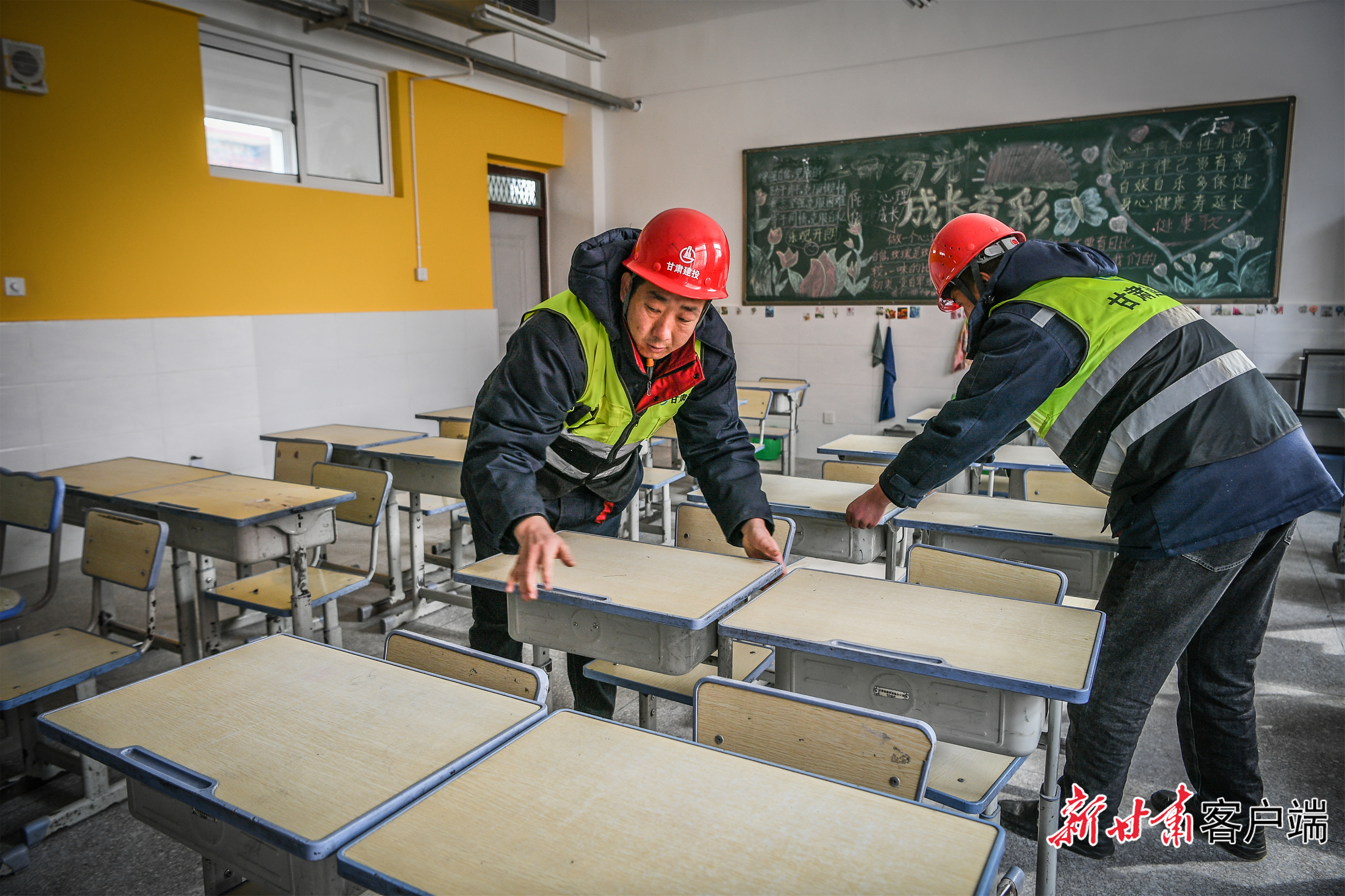 在石塬镇肖红坪小学维修一新的教室里,施工人员正在摆放桌椅。