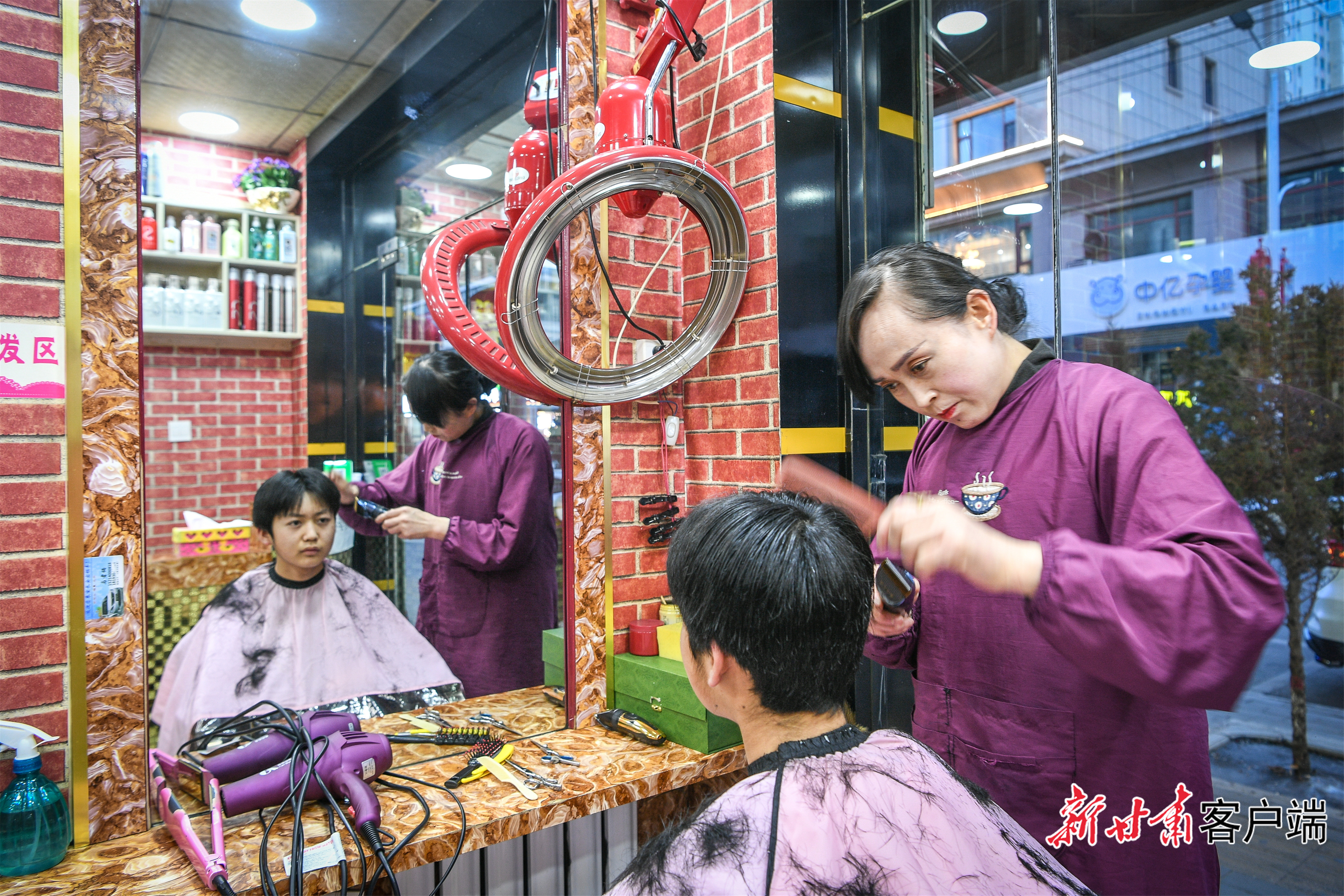 居民在积石山县城一理发店理发。